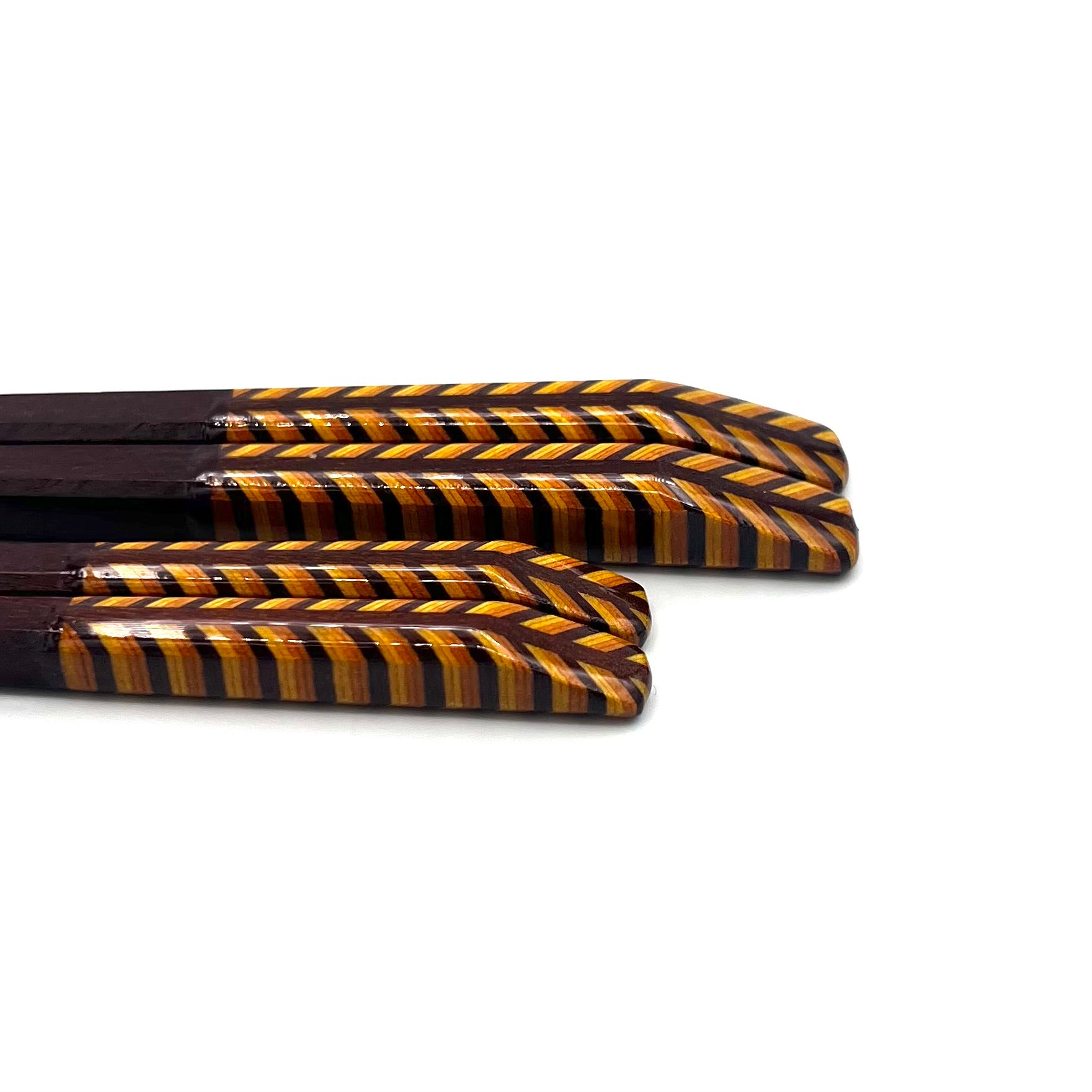 These chopsticks showcase intricate yosegi marquetry, created by assembling various colors and wood grains into beautiful patterns. They feature a sturdy square-shaped handle, providing a comfortable grip.